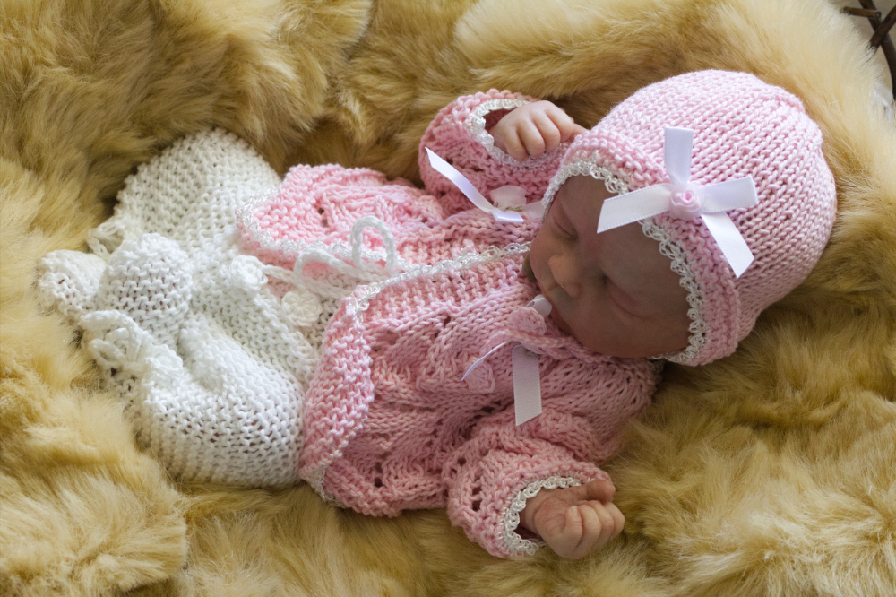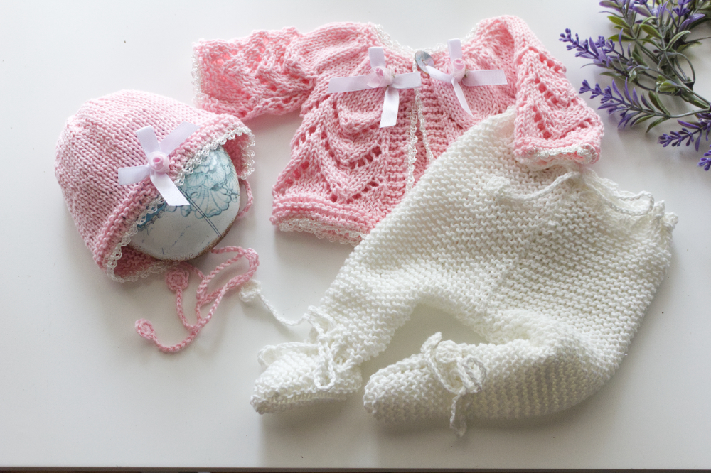Pink and white Jacket Set for 15-16 inch dolls jacket has front opening that secures at neckline with a shell button, pattern knitted into lower section matching bonnet both edged with white rayon footed leggings in what to contrast