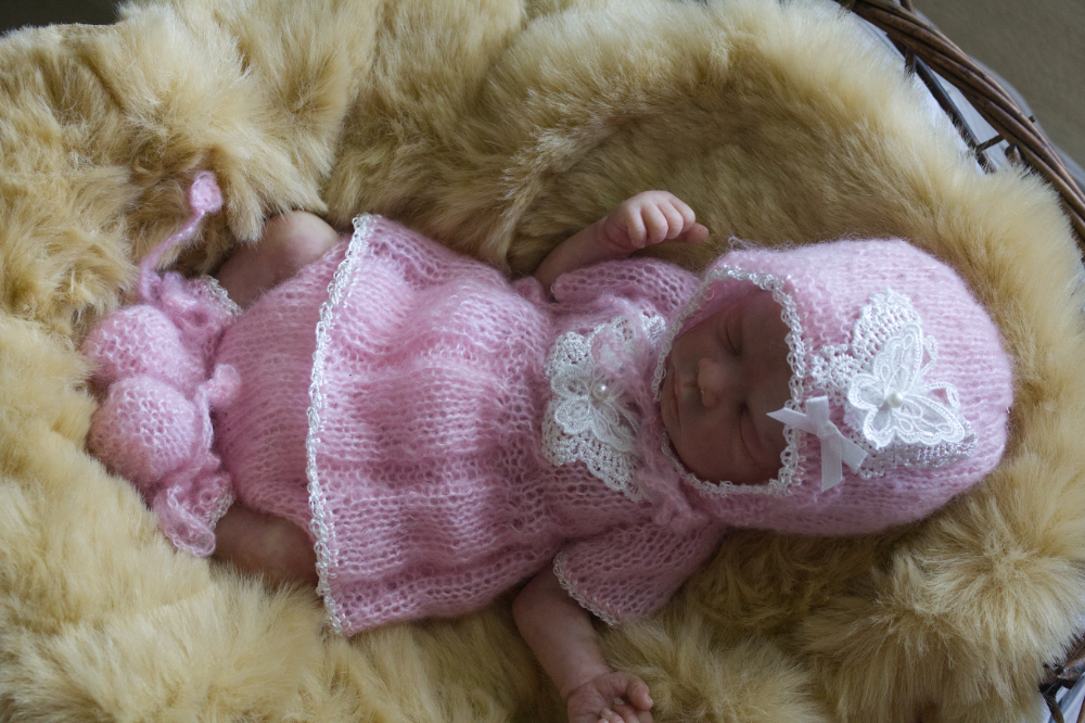 hand knitted in fine kitten mohair with a soft pink crochet rayon edge. decorated with lace and ribbon roses - diaper cover with draw string waist bonnet and booties complete the set